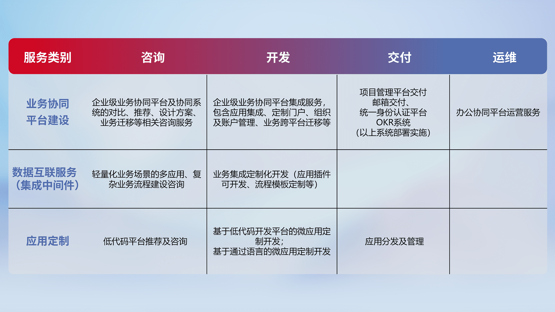 针对钉钉、、、企微、、、、IDaas等平台级产品提供产品的规划、、方案、、、交付、、、定制化开发等服务,,,,实现如统一协同办公、、、智能客户服务、、、混合会议管理、、、、智能数据查询、、等业务场景,,,实现数字化转型。。。